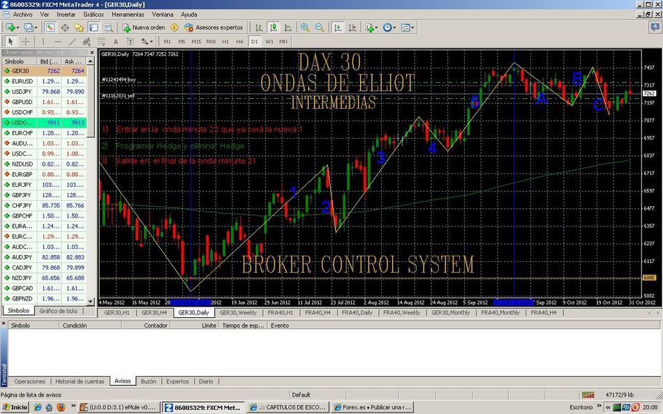 Utilizo el indicador Elliot Wave Broker Control system que no es ni más ni menos que el indicador Zig Zag personalizado por mi, indicador el cual es sumamente retardado en la señal pero si me hace un conteo de ondas muy certero, muy aproximado y en la mayoría de las ocasiones exacto en cuanto al número de subondas minute que una onda intermedia o una onda menor posee sirviéndome dicho conteo para entradas y salidas filtrando las mismas con el indicador del tiempo y el Fractals de Billl Willians, intentando por otro lado entrar siempre en un pullback o en un throwback según sea el caso. Como he comentado en alguna ocasión trabajo las ondas intermedias de principio a fin utilizando el conteo de las subondas minute como señal de inicio y de final de las ondas intermedias, estudiando y analizando también las ondas menores para actualización , confirmacón y en casos correción del conteo de las subondas minute. Este indicador para el uso que yo le doy me aplica mucho mejor en índices que en divisas ya que son menos volátiles que estas últimas, menos agresivos, más armónicos en definitiva, salvo excepciones de algunos pares no lo recomiendo para forex por lo general aunque reconozco que no he profundizado con el tema divisas ya que yo me especializo en índices bursátiles sobre todo en el DAX 30. Última edición por BROKERCONTROL el 03 Dic 2013, 21:15, editado 5 veces en total