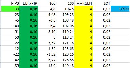 Muy buenos dias, gracias a todos por los buenos comentarios, veo que alguien le interesa y lo agradece. Yo sigo a lo mio y os pongo algunas observaciones, les parezcan buenas o malas, a alguien les servirá, incluso para tener nuevas ideas: -Bien comenzando con 100 euros, esta claro que podemos arriesgar mas, para este nuevo periodo de trading haremos caso a las recomendaciones y comenzaremos arriesgando 4% a 1/500 que son 0.02lotes 0.16eur/pip. Y aumentaremos el lotaje cada mes multiplicándolo x2 (aquí preveo criticas  ), con esta gestion, observaremos que en el inicio de algún mes, el riesgo puede llegar a tocar el 10%, eso si el mes anterior fue algo malillo, NO EN PERDIDAS, pero a medida que va transcurriendo el mes va bajando el riesgo. Repito, esto solo pasa algún mes. -Otra cosa curiosa, es que en el uso de soportes y resistencias, y tal y como se opera en esta estrategia, cuando la entrada esta a menos de 10 pips de la 3º S/R diaria, es el único caso en el que no pondré TP, ya que no se si alguno opera con 4º S/R, yo no opero con 4º S/R así que cerrare posición a las 23:59 de ese día, el momento en el que sitúo otra nueva orden. Esto lo hago porque cuando supera esta S/R es como si fuera catapultada en esa dirección, ya que no se topara con mas S/R, repito la 4º no se utiliza. -Y concluyendo el periodo demo de estabilización de la nueva estrategia de dos entradas os dejo los resultados Un saludo
