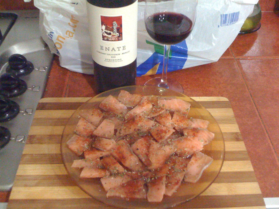 Un Carpaccio de Salmón bien aliñado y un buen vino Enate Somontano. Se puede acompañar con una lata de sardinas, queso, embutidos por si falta algo. Unas rebanadas de pan chapata tostado, untado con ajo y aceite de oliva, y a disfrutar de la vida jejeje. Igual a alguno no le gusta el pescado crudo, pero para mi gusto es una delicia. Con atún igual. Se saca del congelador el lomo de Salmón o de atún (es importante congelar la pieza unas horas para evitar el Anisakis, así evitamos todo lo malo de microorganismo que pueda llevar el pescado crudo). Se deja 5 minutos al aire para que coja temperatura para poder cortar finito con un buen cuchillo japonés a finas lonchas y ni antes ni después se va poniendo en el plato. Se aliña con orégano, sal maldon, pimienta picante y aceite se oliva. Se deja reposar un mínimo de 10 minutos para que no esté frio y a la mesa. Una verdadera mina de Omega3! Esto si que es dieta Mediterranea amigos... para el que quiera hacer turismo, que lo sepa! Que aproveche! Saludos.