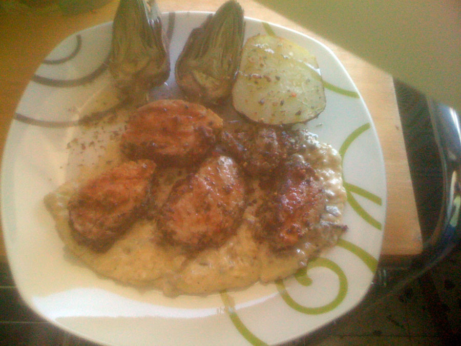 Por ejemplo un solomillo o un pescado, sabe mejor a fuego muy fuerte y poco tiempo porque sella la parte exterior y deja poco hecha la parte de dentro. Hecho así es 1000 veces mas sabroso que pasado o dejado enfriar. Luego... de inmediato ha de ir al plato para comerlo, así que eso es la parte final de todo. Ese solomillo de la foto estuvo en el fuego 1 minuto, no más... pero en una plancha que ardía como el demonio, jeje. El aliñe de especias es uno dificil de encontrar, pero lo podeis sustituir por un molinillo de esos que pica pimienta y tambien se puede añadir oregano. Las patatas y las alcachofas se hacen a la brasa, o tambien se pueden hacer al microondas previamente y luego cortar y terminar en la plancha. La salsa yo la hago picando cebolla y setas gírgolas muy fino en una sarten con aceite de oliva... luego lo flameo con dos dedos de cognac y bajo el volumen del fuego para poner la crema de leche y una pastilla desmenuzada de concentrado de caldo de verduras. Aqui se remueve sin parar hasta que espese sin que hierva. Se corrige de sal y pimienta y a emplatar! Paso 1: Tener las alcachofas y las patatas calientes en el plato. Paso 2: Poner la salsa en el fondo. Paso 3: Hacer el solomillo en 1 minuto para comerlo en ya! Paso 4: poner una copa de buen vino, claro que si. Que aproveche.