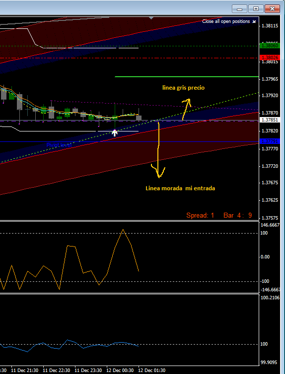Si ven la figura la linea gris es el precio y la linea morada intermitente es mi entrada, esta entrada es con 0.1 spread, si fuera con spread 0 seria debajo la linea gris. Asi puede comprobar sin dar muchas vueltas si el spread y slipped esta funcionando correctamente, sencillo haga el ejercicio. compare con otros brokers y se dara cuenta a que distancia del precio le queda tu entrada. Sin estrategia se está dispuesto a intentar cualquier cosa Porter
