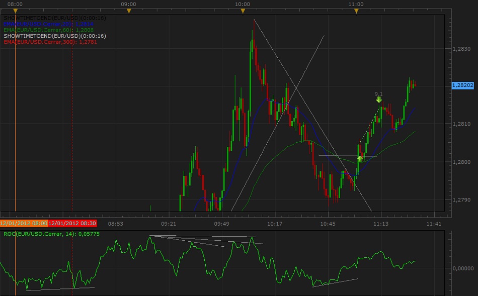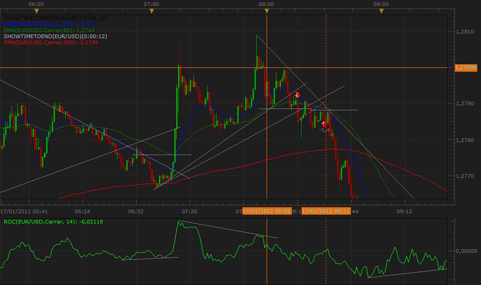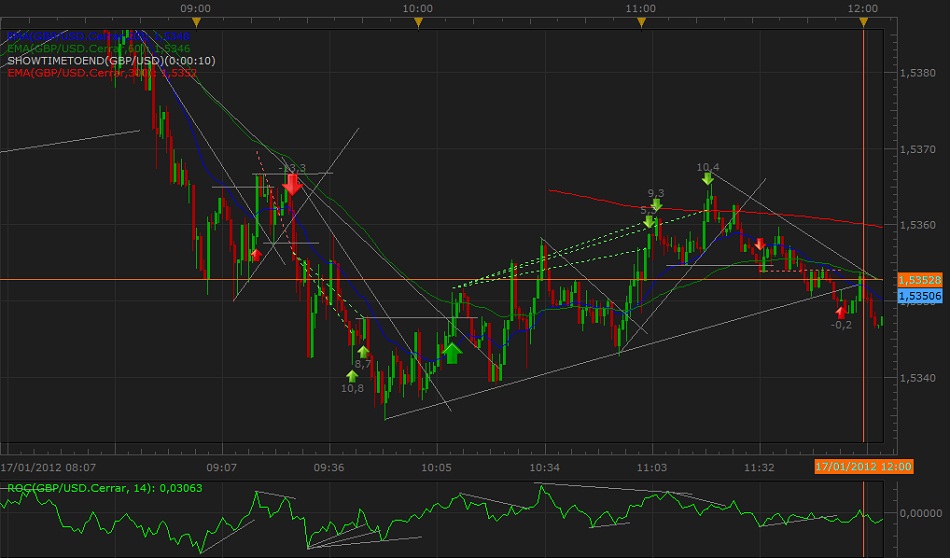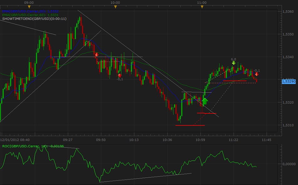 Re: Mis Operaciones del Día 17-01Hola después del feriado bancario y distintas ocupaciones del día lunes, volvimos al mercado, la sesión de hoy es de esas en las cuales hay que tratar de no perder o perder lo mínimo, comencemos el análisis de lo que hemos hecho: la primera entrada fue en el EUR-USD, divergencia quiebre de swing señal completa, el precio queda con cierta indecisión y la proximidad con una noticia (8:30hs) EST, si bien de medio impacto me hizo ser defensivo y acercar mi stop loss, el precio hace un impulso en contra de la posición y salta el stop, una pérdida mínima pero pérdida al fin -5 pips, de aquí en mas fue una especie de jineteada con el precio donde la rapidez mental y concentración son fundamentales, la segunda entrada es en la GBP-USD, el precio rompe en falso y se va en contra cuando vuelve en una dirección favorable supera el máximo anterior pero genera divergencia en el indicador, en ese instante acerque Stop, al swing anterior y coloque una orden de venta sobre el mismo, el precio se va en contra cierre con stop y entrada en corto hasta allí -13 -5 = -18, el día venia complicado, en la zona de 10 pips, realicé un cierre parcial finalmente la operación fue positiva y descontamos, de mas esta decir que a esa altura solo quería dejar el día en cero ya que todavía tengo tres mas por delante, la cuarta operación es en compra el precio osciló hasta que me dió la posibilidad mediante cierres parciales de asegurar la posición, hasta allí -1.5 pips el balance diario, al cerrar la cuarta entrada y antes del cierre de la ventana euroamericana tuve la última señal que debo reconocer no la esperé demasiado donde el precio osciló sin convicción y ni bien pude bloqueé la posición.