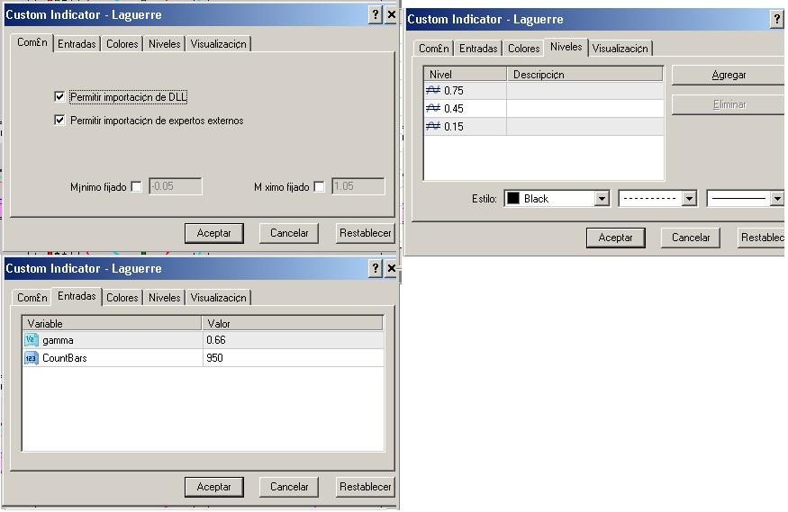 Hola Alveiro Posiblemente aplicaste mal recuerda que al ejecutar el instalador debes escojer la ruta de tu broker te recuerdo algunas por lo general son asi: Esta para FXDD C:\Archivos de programa\FXDD - MetaTrader 4 Esta para Interbank Fx C:\Archivos de programa\Interbank FX Trader 4 Esta para Forex.com C:\Archivos de programa\MetaTrader 4 at FOREX.com Esta para Alpari UK C:\Archivos de programa\MetaTrader - Alpari UK Esta para la plataforma que bajes directamente de http://www.metaquotes.net/en/metatrader4 C:\Archivos de programa\MetaTrader 4 Al ejecutar la instalacion correctamente solo abres metatrader hac cliick derecho sobre el grafico y escojes la opcion plantillas o template si esta en ingles y luego escojes Mobile Trends Silver y listo en esa forma debe quedar tu template configurado automaticamente todo sin embargo la configuración del Laguerre es la siguiente te adjunto una imagen ajj y recuerda Laguerre no es un Estocastico es un indicador totalmente diferente al Estocastico. Bye espero piyes muchos pips Cordialmente Worldteam Entrenado como militar, educado como intelectual, criado como monje y listo para la grandeza