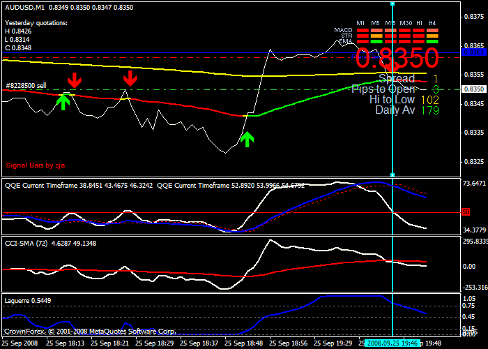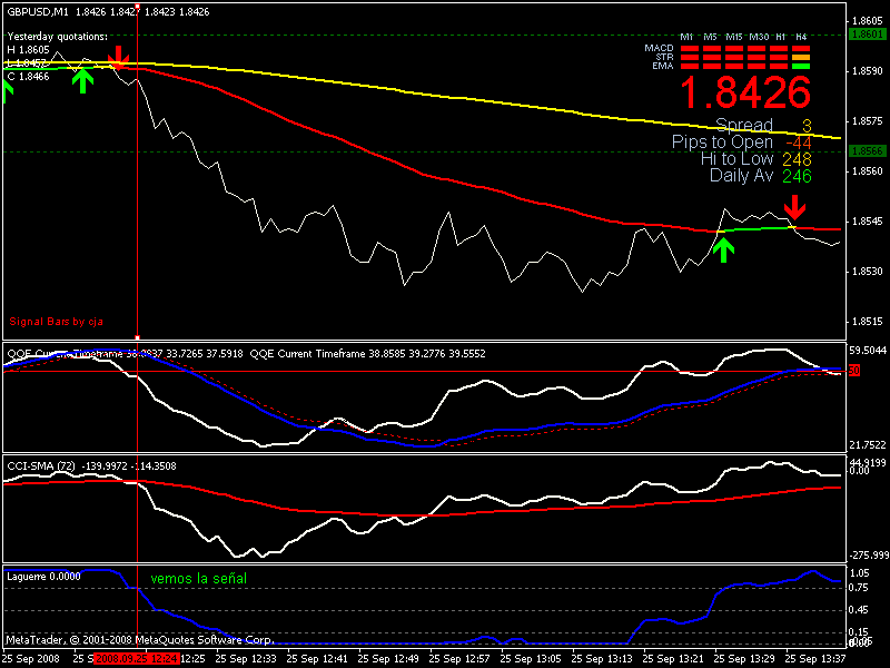 hay gente que no se aclara y no entiende las señales, por ello e agregado el indicador LAGUERRE A 0.80, nos filtra los malos oficios y las malas señales. Simplemente descargar el archivo lo agregais a metatrader4/experts/indicators y os saldra en la lista de INDICADORES PERSONALIZADOS, lo ejecutais y modificais el 0.66 a 0.80! La lectura de este indicador es la siguiente: cuando pasa de 0.15 hacia arriaba compramos, si se da una señal y laguerre esta superior a 0.45 compramos. En venta pasa de 0.80 hacia abajo, si se da una señal y laguerre esta debajo a 0.45 vendemos. OK? filtraremos muchas señales falsas!! Pongo ejemplos e indicador, tambien pongo plantilla para los menos avispaos!