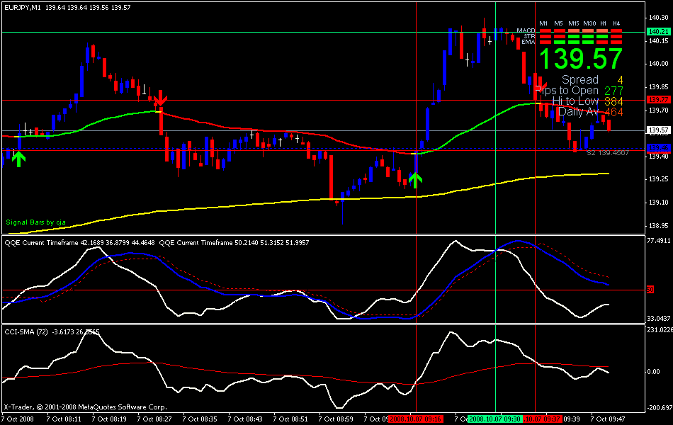 Yo estoy probando la estrategia solo en EUR/JPT, de momento me va muy bien. Acaba de coger una operación con 60 pip. DE todos modos veo que ademas de dar buenas entradas y interpretamos bien las lineas del QQe y del Cci-SMA se pueden pillar tambien los retrocesos pues en determinadas condiociones hace una lectura bastante fiable del movimiento de esta grafica. Observando pares de carry-trade se mueven con las mismas señales del EUR-Jpy, pero se sacan mas pips. NO he puesto la plantilla en el AUD_JPY, pero cada vez que tengo una señal en EUR-JPY el AUD-JPY y el GBP-JPY suben a la vez pero con mas fuerza. Sería interesante ver el tema de los retrocesos pues creo que si te familiarizas con un par, con ninpolines puedes hacer muchas mas operaciones que las estrictas del sistema, asumiendo un poco de riesgo, pero creo que compensa en este caso. Cuel el grafico con la operación. las lineas en rojo representa el punto de entrada y el punto de salida usando el cruce de la linea roja con la linea azul del QQE. En verde es usando la linea blanca con la azul para salir (Es la que he usado yo). Si os fijais cuando se cruza la linea blanca con la azul se produce el retroceso, si compraramos estariamos comprando contra la tendencia de 5 min, pero en general he visto muchas operaciones muy buenas de rretroceso, sobre todo cuando se mueve por un canal, como es este caso, y el cruce se produce muy cerca del soporte o la resistencia del canal. tambien nos podria ocurrir que ese canal fuera perforado, pero no he visto aun el caso de que se cruce la linea y se rompa en canal actuando en contra y siempre nos podemos proteger con un SL por encima o por de bajo de la resistencia o del soporte respectivamente. ¿Que opinais? Podriamos comprobar tambien estos detalles y sacar el maximo partido a este sistema, que es muy bueno. Un saludo.