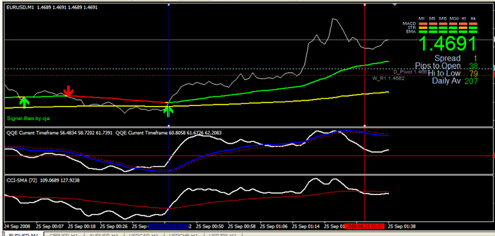 Por ejemplo el precio cruza Ema55 hacia abajo y vendo SOLO SI: EMA 275 esta sobre el nivel del precio, osea detrás de la flecha roja. y la linea blanca de QQE cruza hacia abajo la linea roja horizontal 50. Y la linea Blanca de CCI cruza hacia abajo la linea roja y En M5 Ema55 esta en rojo. La salida es Azul vs Roja en QQE. Esto se supone que es una entrada segura pero he tenido problemas cuando se cumple todo esto ya que he tenido que cerrar operaciones negativas. Y creo que es por el siguiente problema: Cuando OPERO en venta o en compra, TODOS los indicadores citados anteriormente están RECIEN tomando la posición a favor, incluyendo el EMA55 en M5, por lo que pregunto: Si es conveniente operar de esta manera? y si lo es? por que no me resulta tan oportuno como a ti ninpojutsu? No sabría decir que estoy haciendo mal!! Quizás alla sido una mala racha, mañana tratare de probar nuevamente, agradezco me den un consejo. Una critica podría ser que el sistema da muchas falsas alarmas, o por lo menos puedo decir que en la mayoría de las operaciones el precio con respecto al EMA55 parecía borracho en carretera.