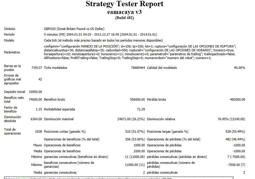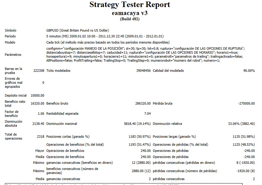 Re: Mi nuevo robotDe momento estoy consiguiendo mejores resultados con la versión sin indicadores, con ordenes pendientes a pelo y jugando con los horarios. Aquí os dejo un bt con la primera versión, periodo de 3 años, sl/tp 30 / 30 pips, GBPUSD. No es que sea para tirar cohetes... pero a ver si la nueva versión con el MACD lo puede mejorar.