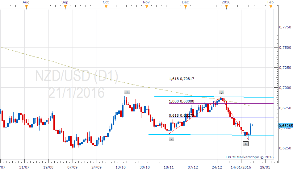 Del gráfico interpreto que posiblemente se encuentre en el inicio de la 5ta onda impulsiva, al rebotar en la zona de soporte del canal, de hecho hubo una señal de posible reversión dada por la vela del tipo pin bar y confirmado el impulso con la vela del 21 de enero. Lo cual de cumplirse la reversión el precio debería de llegar a la zona de resiste del canal, y pudiéramos esperar si hay un breakout la acción del precio pudiera llegar hasta el 161,8% de acuerdo a Fibonacci expansion. Veamos el comportamiento de la acción del precio y busquemos una posible entrada en long en el par NZD/USD.