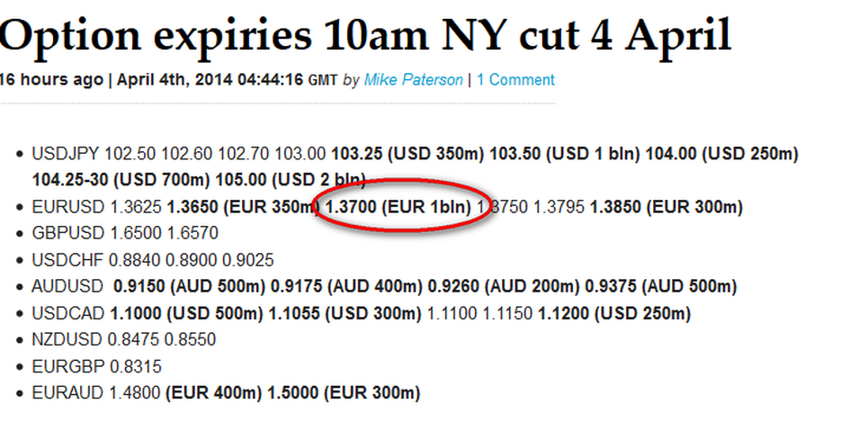hoy a las 10 horario de nueva york han expirado 1000M de opciones para el EURUSD en 1.37000, y ¿ dónde estaba el EURUSD a esa hora ? pues ahí con una precisión que da miedo, echadle un vistazo a la gráfica de 5 m
