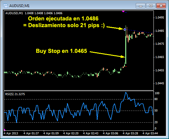 Muy buena pregunta. Creo q no hay muchas alternativas, pero yo veo estas: * encontrar broker q es "honesto" o q roba poco, * operar otros mercados, * no operar. Tu q opinas mmexico70? No queria entrar en la polemica y/o desviarme del hilo inicial q es sobre operar fundamentales. No tenia tiempo acabar mi comentario anterior, pero ahora os dejo mi conclusion final q es la siguiente: "5 Operaciones Fundamentales x Mes, total: 140% de Retorn" ...si es posible, pero personalmente creo q solo en cuentas micro de 100$ o max 1.000$ Ok, intenta tradear noticias en 1 cuanta standard con 10.000 $ o mas y hacer 140% con 5 trades y veras como el broker te marcara con banderita negra y luego intenta otra vez hacer otros 140% en proximos 5 trades Si tu tienes buena experienca, me encantaria si podrias compartirla con nosotros. Yo os dejo aqui mi ultimo trade de esta madrugada en AUD/USD, donde hemos operado Retail Sales de Australia. Yo lamentablemente he perdido x 1 solo pequeno deslizamiento de 21 pips de Buy Stop, pero 1 amigo gano 14 pips. Q pena q no he podido grabar 1 video en ese trade, para q veais cuando me refiero q broker roba. En fin, aqui va la imagen x lo menos. Espero vuestros comentarios ...salu2