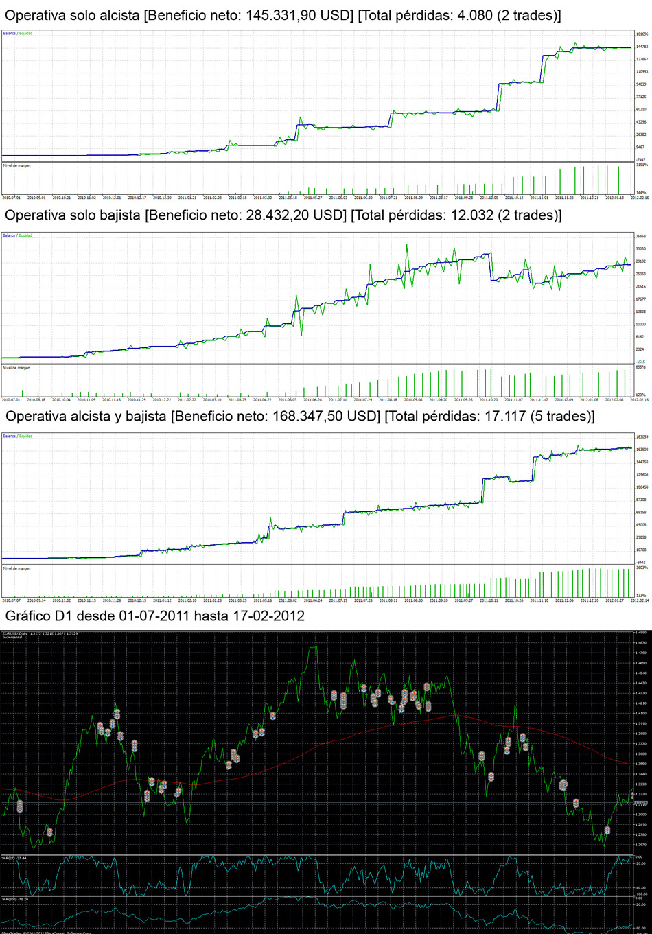 He mejorado mucho el EA y ahora es exponencial y protege mucho mejor las perdidas, hasta el punto de que en este nuevo backtest que os adjunto desde Julio de 2010 hasta hoy (Febrero 2012), más de un año y medio, solo se produce una pérdida de 30 USD. El stop loss que he utilizado es en todos los casos como máximo 100 pips. Es variable en función de las condiciones. Las tres pruebas solo operativa alcista, solo bajista y ambas están hechas a partir de 250 USD. Empiezo a estar contento con este EA y es probable que la semana que viene lo ponga en tiempo real en una cuenta demo a ver que hace. ¿Qué os parece?