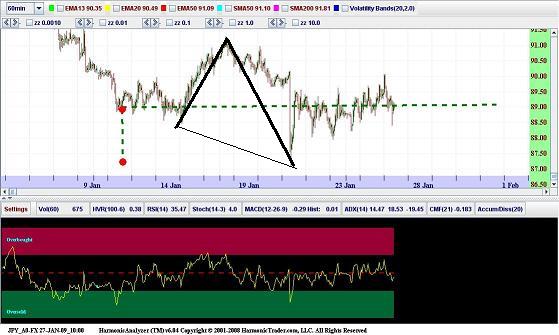 Esta gran controversia fue una de los tempranos desafios que encare cuando inicialmente redifini el patrón .Acordamos con varias personas que todos los "patrones gartley no son lo mismo"Si cabe, el mayor efectivo "Patrón Gartley"requiere una exacta especificación de Proporciones fibonacci para validar la estructura.aunque la general estructura ha sido subrayadapreviamente,no fue hasta que El OPERADOR ARMÓNICO fue lanzadoen 1999 que las exactas reglas para especificos retrocesos del punto B en 0.618 y el punto D en un 0.786 fuerón asignados hacia el patrón. estea alineacion se ha convertido estándar en la comunidad tecnicay es ahora comunmente referida como el Patrón Gartley.El exacto punto B 0.618 de requisito fue una condición en esta interpretación de la estructura. El operador armonico tambien subrayo la importancia del patrón AB=CD y la proyección BC reglas que requerian específicas condiciones para validar la estructura.La potencial zona de reversa (PRZ) de un Gartley posee varios otros elementos que diferencian la estructura de otros patrones.El patrón tendria que poseer una nítida e equivalente Patrón AB=CD que converge en la misma área que el retroceso 0.786.de XA.De, hecho la terminación del equivalente patrón AB=CD y el retroceso 0.786 son un requisito minimo para un valido Gartley.Frecuentemente, el retroceso 0.786 va por encima del patrón AB=CD dentro de la zona de reversa. En estos casos, esta convergencia es el nivel definitivo de la PRZ. La proyección BC es otra especifica condición para validar la estructura y esta no tiene que exceder un 1.618. Aunque la proyección BC es un numero menos significante en la PRZ que en otros patrones,el limite1.618 ayuda a diferenciar la estructura GARTLEY.Tipicamente, una extensión mas grande que un 1.618 es tipicamente encontrada en las estructuras Murcielago.A pesar de los requisitos de numeros en la PRZ, el Gartley tiene que poseer un preciso punto B en 0.618 de retroceso para validar la estructura.De hecho, Patrón Gartley requiere la alineación mas precisa en el punto B de todos los Patrones Armónicos para definir las mas validas oportunidades. Patrón Gartley elementos: .Un preciso punto de retrocesode la´pierna XA en 61.8%. Una proyecciónBC que no tiene que exceder 1.618. .Un retroceso 0.786 de XA. .Un punto C dentro del rango de 0.382-0.886de retroceso. Identificamos una estructura semanal usa-jpy rsi Bamm SCOTT CARNEY