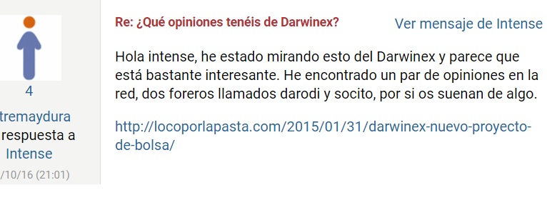 Y ese comentario lo haces en la web locosporlapasta.com (bonito dominio) Que es como "referencia de darwinex" en la búsquedas. Además, Locosporlapasta recomienda la web de: ganarcondarwinex.com (bonito dominio también) Y pertenecen a la misma persona, con el hosting en Hostgator (casualidad??) Para colmo hace pocos días se ha arruinado el trader... reventando la cuenta y a todos los seguidores. http://ganarcondarwinex.com/reviento-la ... -otra-vez/ Y esta es tu cuenta en Darwinex: https://www.darwinex.com/es/user/profile/socito/ Sí, ninguna, no tienes ninguna. Posiblemente por tu nuevo empleo a sueldo fijo. Entonces ya me queda todo más claro... básicamente son campañas de prestigio y creación de varias webs para darse auto-fama, que es mucho más barato que pagar por publi