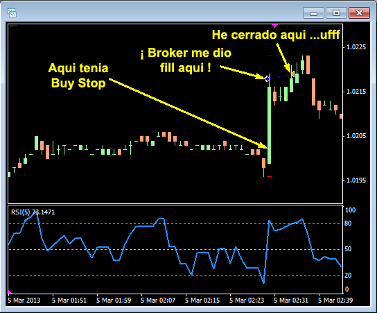 En la imagen la línea de azul es donde tenía puesta mi orden. La de rojo es donde me la ejecutan. Supongo que al poner una orden Sell Stop el bróker vende inmediatamente al precio disponible en el momento en que el precio toque el precio de stop , como si fuese una orden a mercado, no? Justo en la vela de entrada hizo un movimiento brusco y me la ha hecho a un precio mucho peor... ![]()