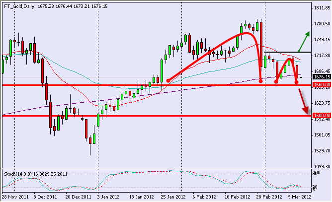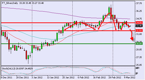 Los metales preciosos parecían tener dificultades para recuperarse de las fuertes caídas que se produjeron hace dos semanas. Cuando el oro se cotizó alrededor de $1800, Bernanke dijo que este nivel refleja una burbuja en el precio del oro, y su discurso causó una extrema venta de oro y plata. El oro cayó hasta el nivel de $1660, en el que las posiciones de órdenes de los operadores comenzaron a cubrir sus posiciones y el precio corregido a $1720. Sin embargo, la continuación de las fuertes ventas en torno a este nivel y el oro está de nuevo cerca del soporte en $1660. El patrón bajista invertido de la "Cup and Handle", apareció en el gráfico diario del oro y si el metal se rompe por debajo del soporte, el precio puede deslizarse hasta $1600. Sin embargo, el apoyo actual se ve fuerte, por lo que se puede ver el oro a al alza a $1700 nuevo. Plata La opinion de Bernanke sobre los precios del oro tuvo una fuerte influencia en la plata, así y este metal precioso cayó de $37,5 a $32,5, un 13% en menos de dos semanas. El metal ha corregido a $34, pero falló en romper, como lo hizo pocas veces durante el mes anterior. La plata está construyendo el patrón "Head & Shoulders" en el gráfico diario, por encima del soporte en $32.5, un fuerte desglose de este apoyo puede ser que tire el precio a $30.0 $30.5. Sin embargo, la vela de ayer terminó con una cola inferior, lo que significa que hay un apoyo en los niveles actuales, y la plata puede tratar de volver a intentar romper $34.