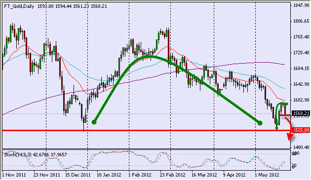 Re: El Oro y la Plata -AnálisisEn el comienzo del mes, se mencionó el nivel de $1630 como en el apoyo importante que si el oro rompía, se derrumbaría. El metal precioso rompió este importante apoyo y derramó 100 dólares desde entonces, hasta que llegó a los mínimos del año en $ 1525. Los compradores esperaron allí la semana pasada y ayudó al oro para corregir el 50% de la caída, pero ayer se creó el patrón de reversión a la baja. Parece que los vendedores están dispuestos a asumir el control de nuevo y si el oro cae por debajo de 1560 dólares podría continuar hacia abajo y completar el patrón "copa invertida y mango" de $ 1520 - $ 1525.