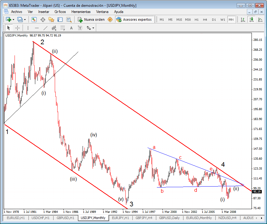 Jjestoico cuando se va a realizar un analisis tecnico de un par basado principalmente en Ciclos , este se debe hacer tomando como base zonas donde aparescan claramente pricipios y finales de los supuestos ciclos, te digo esto pues tu analisis esta basado solamente en una pequeñisima parte del ciclo de dicha moneda y por ende podria ocacionarte perdidas en tus futuras operaciones ,como podras comprobar en la grafica q te muestro del USD-JPY ( 1978 -2009 ) el par ha venido realizando un total de 4 grandes mov o lo q seria igual 4 Ondas y en este momento se encuentra en medio de la 5ta Onda y ultima a la baja pero q todo indica q esta al comienzo de la misma , asi q creo deberias tener cuidado con esa operacion q planteas de entrar en largo despues q el par llegue a la zona del 80.es posible q el par pueda tener un punto de coreccion en dicha zona pero de ahi a q se vaya largo ?, primero deberia romper la fuertisima linea de tendencia q trae bajista desde Septiembre de 1982 ,por otro lado el mismo deberia recorrer un a la baja un tramo equivalente a la directriz del triangulo ( el cual comenzo en 1995 -2008) lo cual deberia llevar al par a zonas como la del 48 .( largo periodo), el par podria llegar o no ,hasta dicha zona sin embargo tecnicamente este es el escenario .Suerte