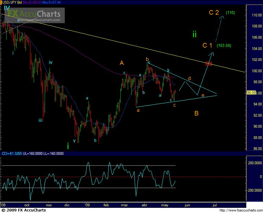 Hola Jjestoico , respecto al tema del posible H-C-H podria ser pero yo tengo mis dudas al respecto y es q el par tuvo una extension en la 5ta onda de la 1ra ( grado mayor)( puedes ver una explicacion en la seccion (Analisis Tec. { USD/JPY } 2 de Abril) me llama la atencion q los mov q esta teniendo el par ultimamente son basicamente en movimientos correctivos (a-b-c ) y debido a ello el par podria irse largo en busca del 103.50 como posible primer objetivo y hasta podria seguir en busca del 110, esta zonas poseen varios obstaculos pero la posibilidad esta latente, como he explicado en varias ocaciones los triangulos se formana basicamente en ondas (iv-4) sin embargo existe tambien otra zona donde los mismos se pueden desarrollar aunque en menor cuantia q es en las ondas (B) y este podria ser el caso, todo dependeria de si el par rompe o no la cifra del 93.84 pues de esa forma retomeria nuevamente la posibilidad del H'C'H.Suerte