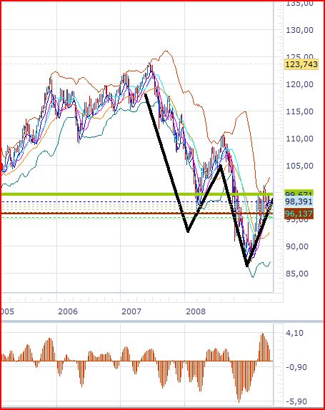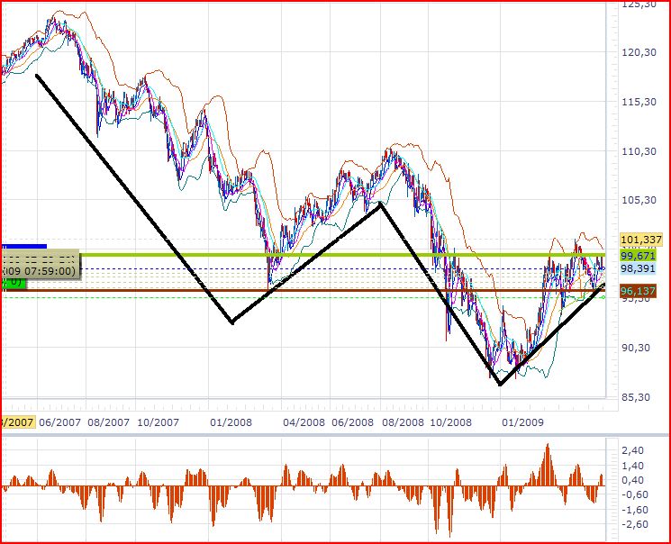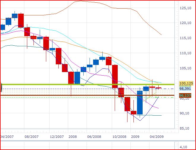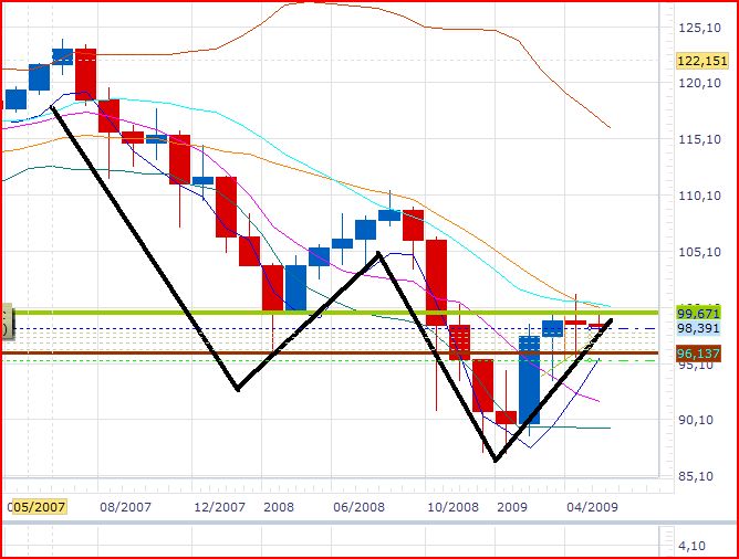 1- Diaria 2- Semanal 3. Mensual Para comparar el mismo objetivo como se ve en diferentes marcos de tiempo, y así ver que opinión les merece. Yo consideraria importante el area 2008 en mensual respecto a su linea verde e igualado a 4-2009. Asi como esa franja verde y marrón ajustan muy bien en Semanal. Gracias. <<Si no tienes un plan estás dentro de los planes de otro>>