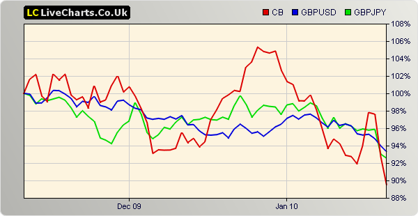 Comparativa GBP/JPY-verde GBP/USD-azul BRENT-rojo