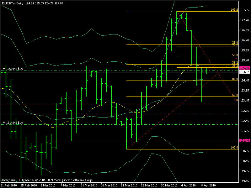 Como bien dices, tenia un buy digamos de 3 contratos en 122,45 aprox. Entonces, compre los 3 contratos en 122,45, con el stop en 121 aprox. El trade funciono y despego, movi el stop a break even, lo hago aprox al 2 dia de haber abierto el trade. O antes si es que el trade despega. Ahora, como escribi en el principo de la semana, deberia haber una correccion. Mira el gráfico: En 127,45 entre con 6 contratos SELL. Osea los 3 contratos buy quedaron "hedgeados" con los 3 sell. Y quedé expuesto con 3 sell más. Me explico? escenario 1) seguian siendo buy, se activaban los stop de los sell, tomaba la perdida de 1% y seguián activos los buy escenario 2) los sell tomaban fuerza. Comenzaba la correccion, Ya estaba adentro la "ganancia" del buy, y ahora iba por el sell. Fue el escenario 2. ahora, llegamos al nivel 61 de las fibbos, el precio reacciona como para ponerse buy. No cerre los sell. Abri, 6 contratos buy más. Osea que tengo. 1) se abrieron 3 buy 2) se abrieron 6 sell, (3 para tomar la ganancia de "1", 3 para exponerse en sell) 3) se abrieron, 6 buy (3 para tomar la ganancia de "2", 3 para exponerse en buy) Como hago esto? con dos cuentas. Una para los buy y otra para los sell. Por que hago esto? Si por ejemplo, el EURJY, comienza una tendencia alcista de X meses. Yo estoy adentro, sumando posiciones a las ya presentes. Claro que solo la exposicion en este momento es 3 buy, a pesar de tener 9 buy abierto, pero el recorrido que haga, si es que lo llega hacer entre el sell abierto, y la nueva corrección, será de 9 buy. Los beneficios de los 3 buy originales, ya estan "tomados" al igual que los de los 3 sell. Dudas, criticas, e ideas, son bienvenidas Salu2 Mariano Mariano
