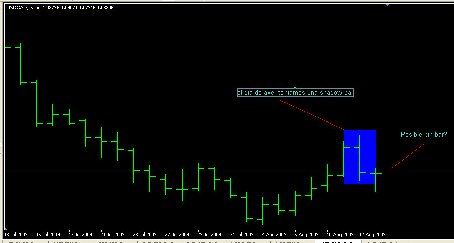 en el par USDCAD, ayer teniamos una shadow bar, hoy a falta de terminar el dia, parece una posible pin bar dejo el gráfico para que lo veas cómo operarias esta situacion? quien manda aqui? la shadow bar de ayer o el posible pin bar de hoy