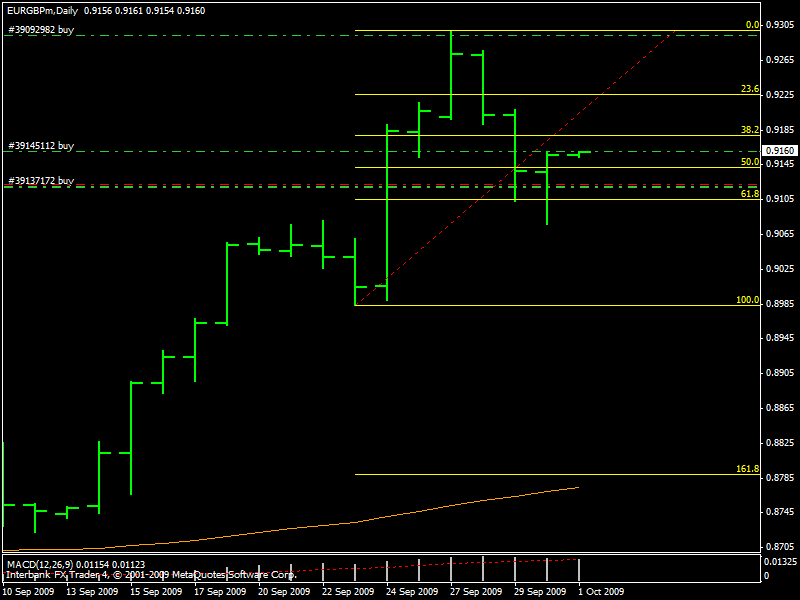 HUY, disculpa, que no la respondi. Mira, generalmente hago 30 o 40 pips y cierro la mitad del trade. Y muevo el SL a BE, O un determinado nivel, que sea resistencia // soporte, segun sea el caso. En definitiva, no tengo una regla clara clara. Puede que este operando en Diario, y que en 4 hs, se forme algo que me haga pensar que se va a dar vuelta, y salgo. Por ejemplo, el EURUSD, ya lo cerre, y ahora estaria ganando más. Y este ultimo del EURGBP, si bien estuvo positivo 20 pips, nunca lo cerre, y volvio sobre sus pasos, y me tiene a punto de sacarme el SL. Ojala que no. Mariano