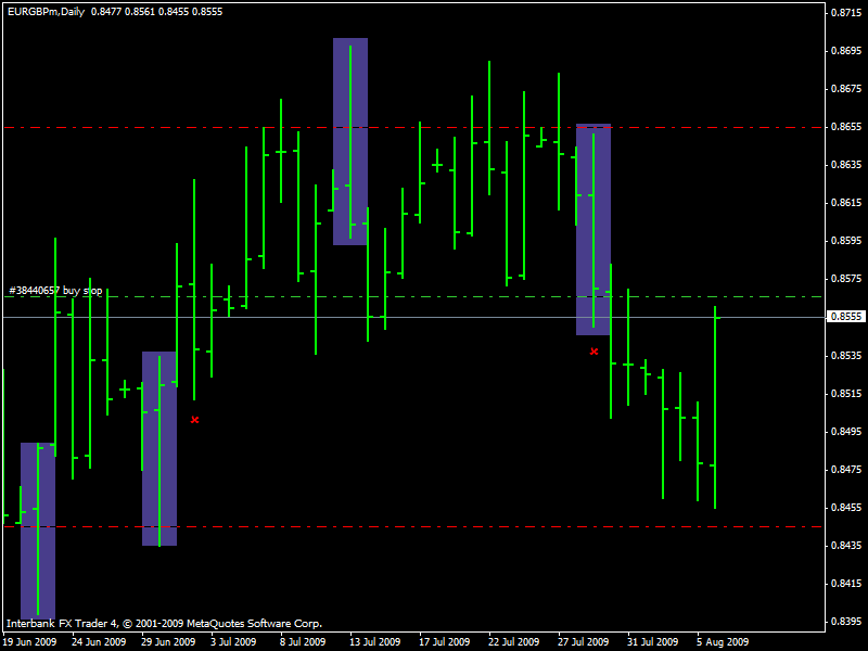 Basados en la formacion de la barras No es nada nuevo, las velas japonesas dan la misma informacion y se pueden utilizar al mismo fin. Yo utilizo las barras por gusto nomás. Opero en gráficos de 4 hs, Diarios y Semanales. Para aprender PRICE ACTION, el mejor hilo que conosco al momento es uno de JAMES16, que esta en forexfactory. Permitanme aclarar algo, ese hilo derivo en un foro privado pago, con el cual no tengo nada que ver, ni nunca fui socio. Sin embargo, hablan bien del foro privado. Dicen que esta la informacion ordenada, PERO ESA MISMA INFORMACION ESTA A LO LARGO DEL ENORME HILO GRATIS de JAMES16. Lo aclaro porque no quiero que digan que la info esta ahi. Yo aqui si interesa ire escribiendo y publicando gráficos. Quien entienda ingles le recomiendo 100% ese hilo del que hable. Miren este grafico Diario de EURGBP, ahi se ven las pin bars que viene de PINOCCIO BAR, PINOCCIO x la larga nariz que engaña. Miren la SHADOW, es cuando una barra cierra completamente a la barra anterior, haciendo un maximo y un mínimo. Hay dos marcadas con una pequeña X, una sombreada y otra sin sombrear. Aclaracion el precio de cierre, debe estar sobre o bajo la barra anterior. Cuando se entra, cuando la nueva barra quiebra el maximo o el mínimo. Por ejemplo, yo tengo colocada una BUY pending order, en el máximo + 2 + spread del high del dia. Con un Stop Lose, en el minimo. Cuanto arriesgo, el 2%, aunque sean 100 pips, uno arriesga el 2% del capital, fraccionando el lote. En este caso el Limit, tambien son 100 pips. Noten en un shadow, que marque con una pequeña X, nunca quebro el minimo, por lo tanto no se activo ninguna operacion. Permitanme algunas notas: Yo escribia en el sector diarios. Deje de escribir unos dias, y hoy me encontre con una serie de consultas en el hilo. Por eso pase a seguir en estrategias. esto no es un sistema automatico. No es un sistema infalible, Pero creanme que es muy efectivo. A mi, me cambio completamente la forma de entender el FOREX, y pasar tener balance positivo en mis resumenes de operaciones. Mariano
