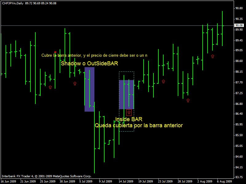 Las flechitas rojas te marque inside bars. Las crucecitas los shadows. Esas barras costitas que ves, son las barras del domingo, solo son 2 o 3 horas de operacion, entonces, la barra del lunes siempre forma un shadow sobre la del domingo, Y no es valida. Ahora, si la barra del lunes, cubre la del domingo y el viernes, yo la tomo como valida. Se entra en el quiebre la barra shadow. me explico? vas a tener la barra pequeña, la que la cubre, entonces se forma el shadow, y cuando la barra que sigue al shadow quiebra el maximo o el minimo, ahi se entra. Puedes poner una pending order, siempre con el stop. Mariano