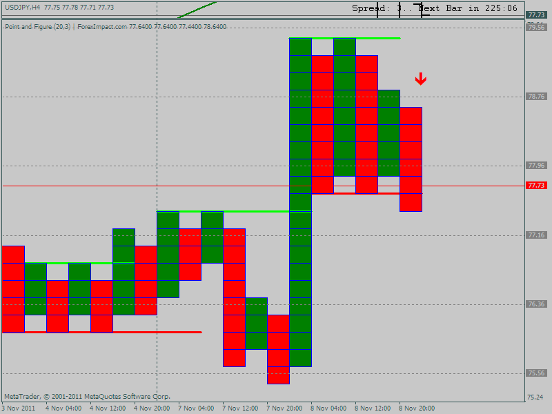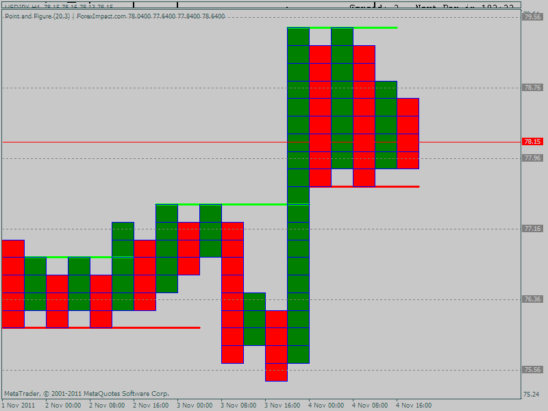 Es muy bueno. Se pueden modificar los tamaños de cajas y de reversión. Tiene alertas programadas que saltan al formarse las figuras chartistas de P&F. Sólo hay que saber interpretarlas. Voy a poner otro que existe de pago. Esta versión es la freeware. Se supone que es el indicador "guachi" ya que modifica la plantilla del meta4 para que convierta la pantalla principal en un gráfico de P&F. La mayor limitación que le veo es no poder dibujar líneas de tendencia, pero merece la pena. Recomiendo usarlo en el GBP/USD ó EUR/USD (vale para cualquier par incluso oro, oil, ...) modificando el tamaño de las cajas en función de la volatilidad (10x3 - M5 y 5x3 - M5, respectivamente). Como es una técnica de hace más de 100 años, sé que se quieren resultados YA, pero está pensada par TF de 1D, 1W... Nuestros abuelos ya ganaban dinero en la bolsa con este sistema cuando no había ni siquiera ordenadores y miraban un telégrafo con las cotizaciones diarias, haciendo estas tablas a mano en una hoja cuadriculada (espera que el dibujo en las hojas cuadriculadas no se empezó a imprimir hasta después de la WWII). El mejor sitio para buscar info del P&F(pero está en orco) es stockcharts.com. Así que olvidaros de las divisas allí. Estoy preparando un tutorial traducido que pondré en mi blog y pondré aquí el enlace. Sl2. http://navarinversiones.blogspot.com/