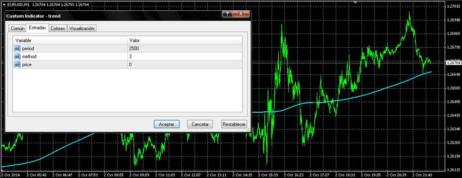 Este indicador que me adjuntas es para marcar tendencias haciendo cortes en la gráfica. El interés que tengo por el indicador "trend" que he subido, es mas por donde pasa la línea en su efecto "Moving Average" que por los colores que marca. A ver si alguno que sepa programar puede hacer algo... como lo de poner el cálculo en el close de la vela, de alguna manera que el motor del indicador no lo almacene al tick en memoria, o algún truco para reiniciar el indicador o resetearlo cada 5 minutos, ya que si lo actualizo entrando en el y dando en aceptar, descarga toda la memoria acumulada sin que se note nada en pantalla. Ya se que es jodío... pero lo necessitooo! Eso que parece la mar de sencillo. Pongo el código aqui, a ver si le podeis echar un vistazo: