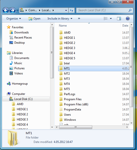 Yo lo hago como en la foto. Nombro los directorios mt1, mt2, etc. Copias el archivo completo del broker, que esta en tu Program files, por ejemplo Meta Trader Alpari UK , y lo haces paste a todos los directorios. que quieras. Despues, haces un icon para tu desktop , llevando al desktop el archivo "Terminal" de la mt4 y lo nombras alpari 1 , alpari 2 etc. Puedes tener los que quieras abiertos con diferentes cuentas..... ahi te das cuanta que no se puede trabajar con menos de 2 monitores J. forex wisdom org