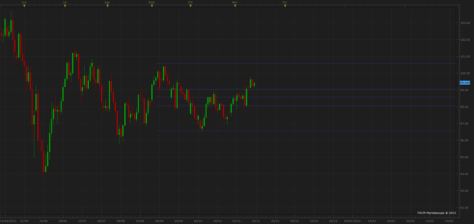 lo que pasa es que con el yen siempre es probable que una rotura te deje fuera de la jugada, pero esta vez no ha sido asi... no es el par mas facil ni mucho menos, es de los dificiles diria yo La parte superior, es decir el 100% corresponde al 100,60... si superamos ese nivel habremos pasado lo mas dificil Un cierre ahora diario por encima de 99,60 confirma seguir al alza de momento cierre por debajo de 99 abre expondria niveles mas bajos saludos