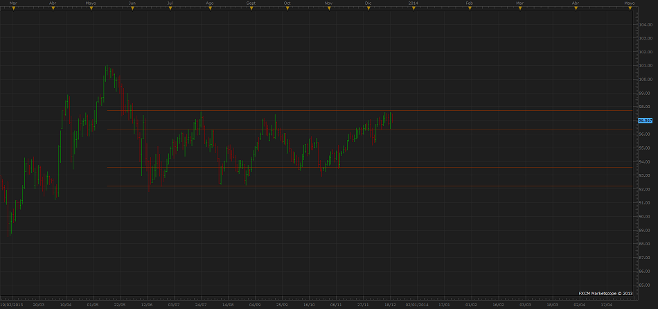 CADJPY Macd apunta alcista y el último LL apenas logró entrar en la parte baja del rango. Huele a ruptura en largos. He hecho una proyección del posible nuevo rango (rojo) que puede hacer este par, basándome en el rango anterior (morado) y en al nivel 101 donde puede tener una resistencia (también me parecía importante el 100, pero parece que en Mayo no paró en él). Tenemos ahora mismo una intento de ruptura de lo que he interpretado como parte inferior del nuevo rango. Aún creo que nos hace falta (para ir mucho más seguros) un cierre diario por encima de 97,5. Entraría ahí con SL en 96 (150 pips... (Voy a intentar ser más prudente con los márgenes de SL para operar en D1, porque observo que los que he mantenido hasta ahora han sido un demasiado justos) No me convence del todo mi hipótesis de la parte inferior del nuevo rango... no siempre el nuevo rango mide lo mismo que el anterior... pero esto creo que es imposible saberlo hasta que no se desarrolla todo el movimiento.