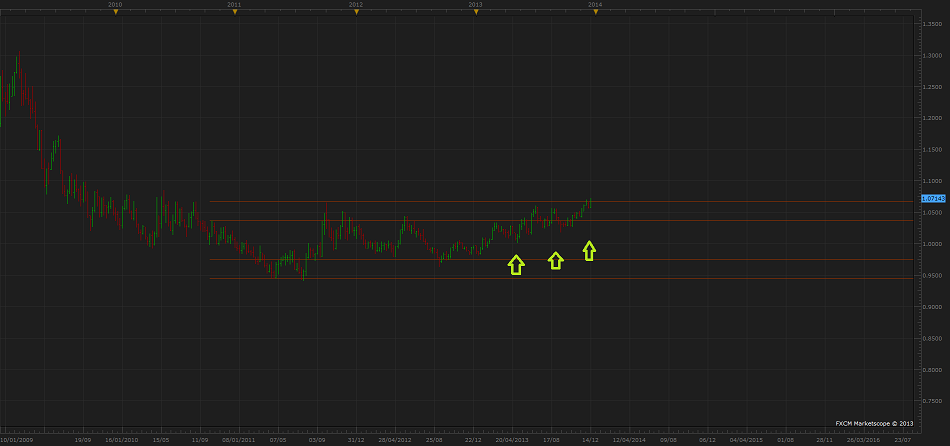 Este par es uno de los de menor volatilidad diaria (59.7 pips en las ultimas 52 semanas según ForexTicket). Podemos ver en un gráfico diario con un zoom bien alejado que no hay grandes saltos en la evolución del precio de este par, sino que parece que se mueve suavemente en una interminable escalera con cientos de pequeños escalones... Un plano más cercano del par: Hemos procedido igual que en el análisis anterior. Escenario claramente alcista y ruptura del extremo superior del antiguo rango, con pequeño pullback y buena vela de confirmación. Tomar posición aquí parece obligado. Entro con un microlote y sitúo mi SL... voy a apurar un poco más por esa vela tan contundente de ayer y lo pondré bajo el último HL... 1.055 Seguiremos su evolución