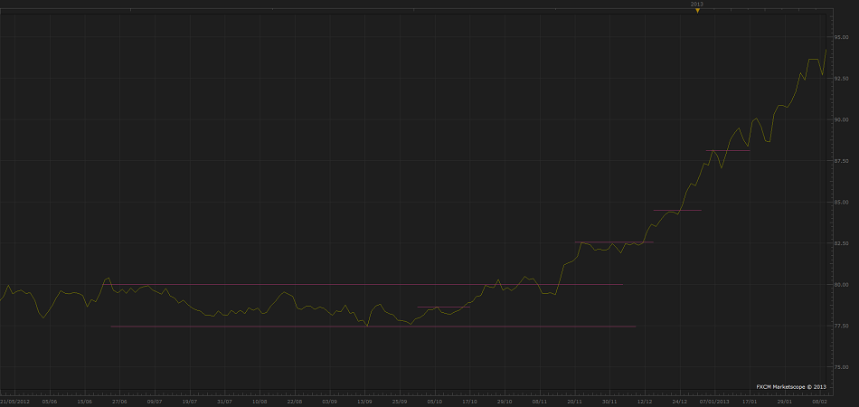 Es notable la claridad para operarse, los criterios muy simples que podemos utilizar para operar con éxito todos esos meses de rango, rotura y tendencia en el par. Incluso desde meses antes, con esta simple técnica, era fácil determinar que el precio se movia en un rango… recordemos que somos comerciantes y los rangos los forman por un lado la oferta y por el otro la demanda… fuera de esos niveles no hay consenso, en este caso el rango estaba formado entre los niveles de precio de 80 y 77.5 yenes por dólar. Facil determinar entonces que es barato y que es caro, no es asi? Dentro del mismo rango se muestra una pequeña línea rosa, esta fue dibujada desde que el precio dejo un máximo, formando asi un pico, después el mismo precio rompió esa pequeña resistencia y los comerciantes tenían agrupadas ahí sus ordenes de compra, justo donde se rompe el consenso… que mejor forma de captar el momentum? De coger al precio con toda su fuerza en la dirección correta? Como aun estamos dentro de un rango de precios y quedamos que 80 es caro, pues vendemos en lo mas parecido a 80 no es buena idea? Al tiempo vemos que el consenso de demanda a 80 yenes por dólar ya esta mas que cuestionado, comenzamos a ver transacciones con consistencia mas alla de ese precio… bien, usaremos la misma técnica anterior, nuestras ordenes iran por encima de 80, por que debemos saber que lo que antes era un soporte, ahora es una resistencia..si tu haces un agujero en el techo podras subir y pararte en el, pero sera difícil que caigas por tu propio agujero! Por lo tanto lo que antes era caro…80 yenes por dólar, ahora es barato! De modo que como ahora 80 es barato y 80 – 77.50 = 2.50 Pues ahora 80 + 2.50 0 82,50 Bien, ahora 82,50 es caro Sera el nuevo nivel de consenso, nuestro primer objetivo de venta. .. aunque dado que se ha roto un rango muy rancio, muy antiguo… no debemos dar por terminada la fuerza que llevo a romper tal rango… De cualquier forma si en ese momento alguien decidiera hacer una venta, su stop loss siempre debería ir por encima de la rotura en contra… por que recordemos que entonces 82.50 pasaria de ser caro a ser barato, por lo que estaríamos comprando caro y vendiendo barato! Ademas no estaríamos siguiendo la clara dirección del mercado, que es totalmente alcista a simple vista, y será asi hasta que las condiciones ahora marcadas por las líneas rosas, sean cumplidas a la inversa, hasta que el precio haga un agujero en el piso y las cosas se inviertan. Ahora comprenden por que los comerciantes hacen todo aparentemente al revés y por que un operador inexperto siempre pierde en todas sus operaciones? Por que no sabe determinar que es caro y que es barato por lo tanto lo hace todo exactamente al revés, compra caro y vende barato, pero ya hemos visto una técnica de comercio para saber cuando se invierten estos roles con toda exactitud . Pueden aplicar la misma técnica para vender cebollas, funciona desde tiempos inmemorables… ese rango mental del que hablaba ahora esta en un grafico, solo eso... espero ahora comprendan lo infructuoso y hasta doloroso que puede resultar perder el tiempo con falsos maestros que solo les quitaran su dinero. Recuerden que como ya hemos visto, las cosas son al revés.. quien busca el dinero se gana la ruina… quien busca servir a los demás acumula riquezas… busquen la paz y el equilibrio, no se apalanquen de forma irresponsable y siempre tengan presente que su mejor maestro son ustedes mismos y su mejor herramienta su sentido común… Disfruten del mercado Bartholomew Roberts.