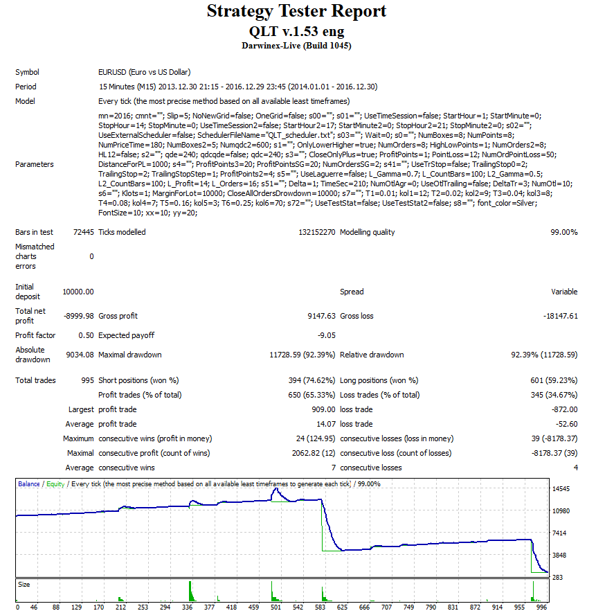 Re: EA Rentable GratisAcabo de probar el QLT en gráfico de 15 min, EURUSD. Como podéis ver en la imagen, se funde la cuenta como debe ser en un grid con martingala