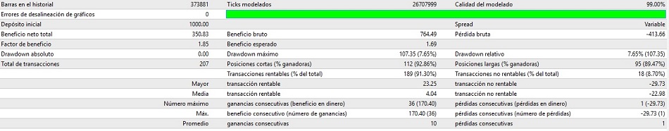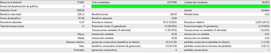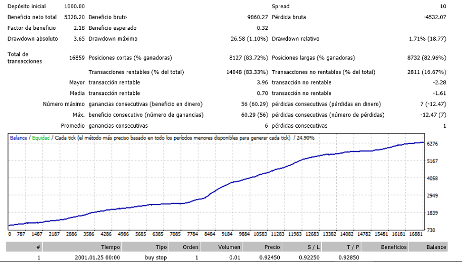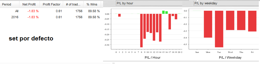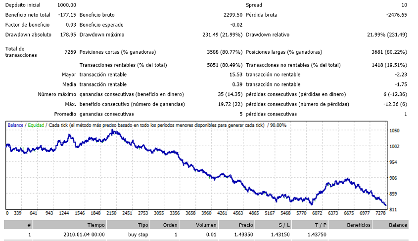 -Pero el problema es que ahora abre a cualquier hora, y solo cambie en 2 parámetros (los únicos que se pueden cambiar) y no deberían afectar las horas de trading por lo cual me genera mas dudas ya que el POBreak y TP no deberían cambiar las horas. -También he observado que el parámetro SL no sirve, este al parecer se mueve según se mueva el TP. -Coloca ordenes pendientes pero estas se modifican muchas veces, haciendo que tenga mas de 1 millón de modificaciones desde el 2001. Eso hace lento el ejecutar el bt. (tal vez esto hace que el software solo analice hasta el 2012) No lo usaría porque todas estas observaciones me plantea muchas dudas, sin código fuente no hay como absolverlas. saludos