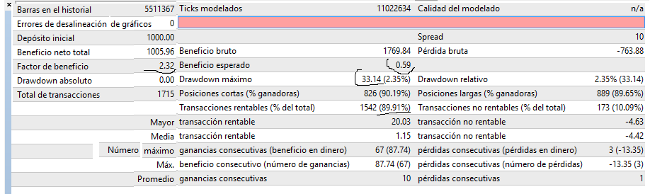 Re: Ea rentable gratis, jaolvidaba tamaño de lote 0.01, capital 1000, note como con el nuevo set el beneficio esperado es de casi 6 pips, y la razón ganancias perdidas promedios mejora.