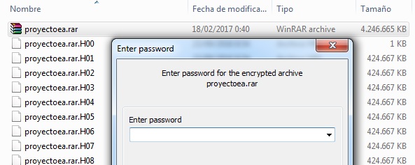 Se han pegado correctamente y me pide password para abrir. El primer password nos lo dió Peter, a ver si colabora y nos consigue el segundo. Me voy a dormir que ya no puedo continuar salvo perdiendo muchas horas. Dejo subiendo una parte del archivo a http://s3.crackzipraronline.com/ que el entero es muy grande para este tipo de webs, a ver si hay suerte.