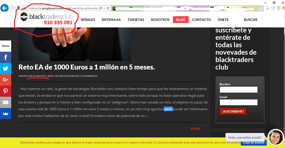 Aca una noticia sobre la pagina Blacktradersclub.com, esta pagina ya fue desactivada pero le hacia publicidad al reto desde el 22 de agosto, esto es casi al inicio del mismo (este hilo empezó el 21 de agosto) http://www.elconfidencial.com/mercados/ ... a_1211421/ La pagina de blacktraders desactivada por la CNMV la pueden ver en el cache de google http://webcache.googleusercontent.com/s ... clnk&gl=pe adjunto imagen de la ultima actualización el 7 set antes del cierre. Estos y el del reto ya están denunciados.