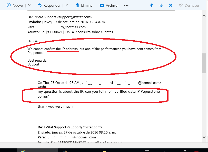 Tambien escribi a Myfxbook y Fxstat, después de varios correos, finalmente responden que cuando usan un EA para actualizar sus operaciones no se conectan al IP ni verifican si es del bróker, con lo cual los datos vienen del mt4 local. Pueden montar un server mt4 tal como el que tienen los brokers y con sus virtual dealer plugin. mueven el bid y ask ensanchándolo y reduciéndolo según convenga (un efecto de spread negativo o directamente colocando un spread negativo) entran al trade ya con ganancias, por eso tocan mas veces el tp que el sl, o por ultimo editando los trade ya hechos. Esto ya se hizo antes, recuerdo que un descendiente de japoneses creo su propio bróker falso con un server mt4, logrando que depositen 500k y simulando ganar hasta 2.5M, luego simulo unas pocas operaciones y "perdió" todo, creo recordar que en este foro hubo un post al respecto, es el que se publicitaba como ganador de un concurso en japon y salio en la tv, pero cuando se hizo la traducción estaban hablando de otra cosa. Adjunto imágenes de las respuestas tanto de fxstat como de myfxbook.