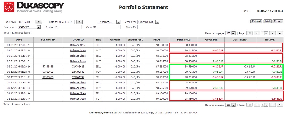 Os pongo la siguiente captura del portfolio de mi cuenta demo con Dukascopy a ver si alguien puede explicarme mejor cómo funciona lo del rollover. Es una posición que abrí el día 30 en CAD/JPY. Cerré dos microlotes el mismo día y dejé otro corriendo La parte que queda dentro del cuadro verde corresponde a las compras/ventas de la operación con sus consecuentes comisiones. Eso está perfecto. Los distintos cuadros rojos (4) corresponden a cada rollover de cada día. Aquí empiezan mis confusiones. Sé que los rollover no son fijos, pueden variar en función de los tipos de interés de cada moneda, pero aquí varían los cuatro días. La cantidad sobre la que se aplica el rollover es siempre la misma... 1 microlote pero cada día el resultado es distinto. Y no sólo es distinta sino que dos días es una cantidad favorable y otros días es desfavorable. Pero lo que más me llama la atención es la magnitud de este rollover para una cantidad tan pequeña como 1 microlote. Puede llegar a 4.65€ en un día ??? Bueno, lo dicho. No entiendo muy bien este tema del rollover (entiendo el concepto de lo que es, pero no cómo se aplica a cada posición). Muchas gracias. Última edición por crlos9 el 04 Ene 2014, 05:07, editado 1 vez en total