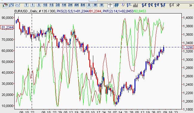 De momento parece que el rumor, hay que dejarlo en STANDBY. Despues del fiasco para USA del NFP (las previsiones eran de -65K y marco el doble -131K),el € salió disparado marcando un nuevo precio en 1'3333 y esta vez sin la ayuda de los Chinos. Desde el pasado 6 de Junio, cuando se bajo a 1'1881 y comenzo la subida, seguía este par en Charts de 4h, pero el Viernes pase a DAILY, con la sorpresa de ver que podemos llegar a ver el 1'40. No creo que la cosa llegue tan lejos, pero el 1'36 casi seguro que lo veremos. En el Chart que adjunto, puede verse donde marcan los 2 Stochastics y normalmente el précio debería ir hasta este tarjet. Quede claro que solo es una ÖPINION, no una RECOMENDACIÖN. Saludos, Enric P/d. Los excepticos con el Análisis Tecnico, mejor pasen del Grafico y sigan sus "robos" entre ellos.