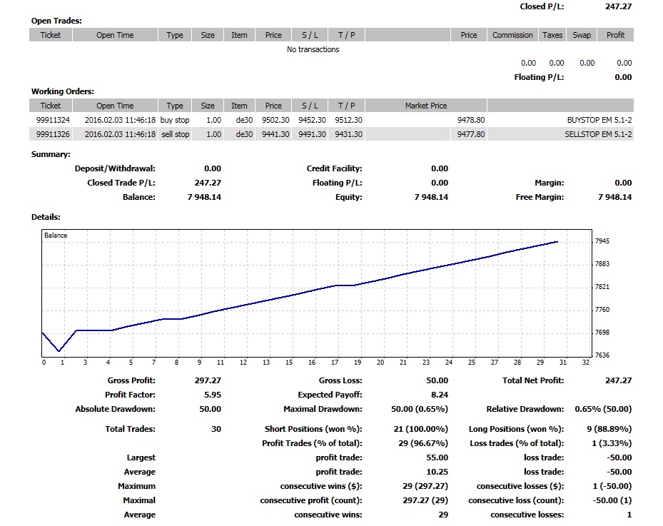 Re: Saben de sistemas automaticos con martingala qué funcionHola Grijan77, aparentemente es un antigrid ¿verdad? Al menos me recuerda al Snowball o a uno de los que hizo Ilan. El problema es que al hacerle backtest en Dax me lanza un buy y un sell stop, se cierran y ya, incluso aumentando el número de compras y ventas abiertas, ¿es normal?