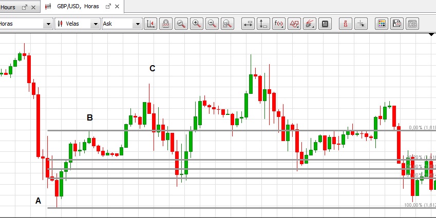 Tengo una duda con el concepto de swing que utilizas en tu estrategia. En el ejemplo que te adjunto si considero el swing desde el mínimo A hasta el máximo B el retroceso no llega a entrar en el área 381 - 618. Sí sucedería si el swing lo considero desde el punto A hasta el punto C. Para tener un buen swing consideras que el precio debe retroceder hasta situarse entre estos dos niveles? Si se considera este segundo swing tendríamos una señal para ir en cortos, ya que cierra por debajo del 618 y en este caso el precio se nos da la vuelta... aunque es cierto que el mercado estaba en un rango (GBPUSD 24 de octubre) Gracias! ;D