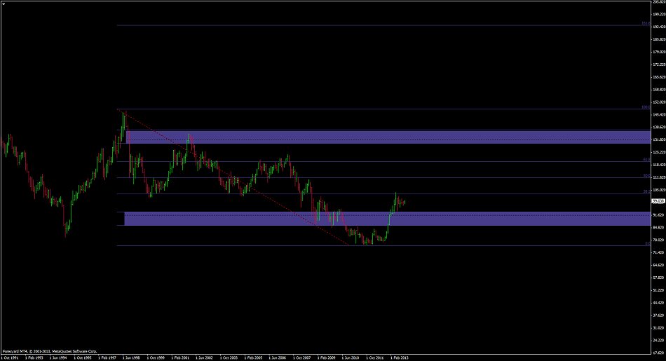 en las barras mas actuales podemos ver que al par no le gusto mucho el nivel de 103.7 y fue rechazado... pero un par de meses despues estuvo en 94,00 y tampoco le gusto...a Kuroda menos... por lo que ahora vamos en camino de 103.70 y despues a 110,00 en un hilo por ahi puse que 107 aunque en realidad sera 107,5 que es el 50% del 103,7 previo y el 110 que es el 50% de el swing a romper/50% fibo en grafico mensual... de modo que cuando lleguemos a esa zona el 107 correspondera a 0.386 se ese swing... de modo que lo pueden mezclar para tener precision o sencillamente pueden usar esta tecnica por ejemplo asi 1w alcista 1d neutro 4hrs a roto el 618 pues tenemos mas elementos para ir al alza y no a la baja... y pueden salirse no se... a la primer heiken ashi de color contrario en un nivel por ejemplo... hay mil formas... realmente es muy simple