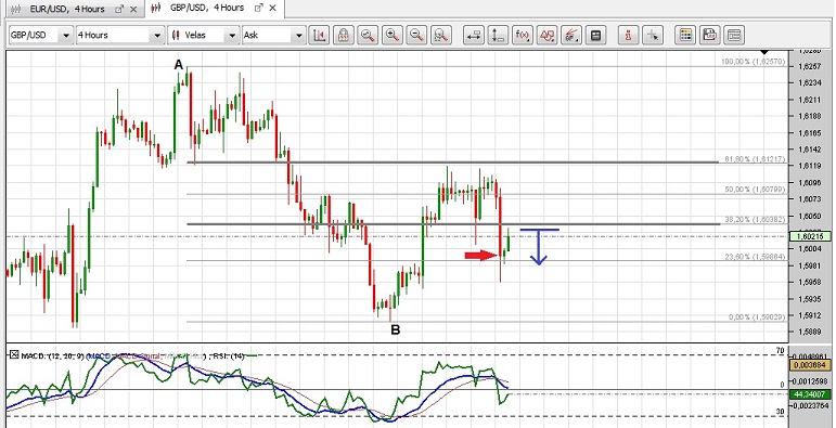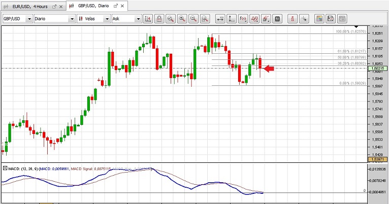 Con la situación actual del GBPUSD utilizando este planteamiento tendríamos una clara entrada en corto, no? En H4 vemos cómo una barra cerró por debajo del 381 (flecha roja). En ese momento podríamos haber hecho la entrada. Después se ha descrito un pequeño pullback hacia 381 que podría ser la confirmación de la entrada (flecha azul) En el gráfico diario se confirma la situación, con el cierre de la vela por debajo de 381 (flecha roja, punto de entrada) y una gran divergencia del macd respecto al precio. Además el precio viene de rebotar cerca del 1.63 que parece ser una resistencia importante para este par. Podríamos considerar que el mercado está actualmente en rango, por lo que habría que estar muy atentos al nivel 0 del retroceso de fibo y buscar ahí signos de debilidad para salir, aunque tiene pinta de querer romper a la baja dicho rango.