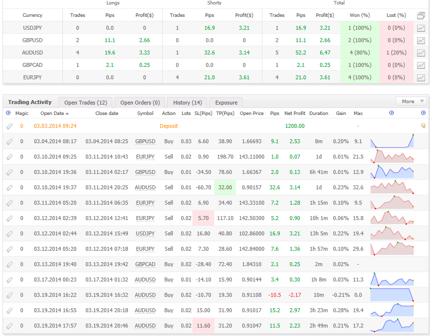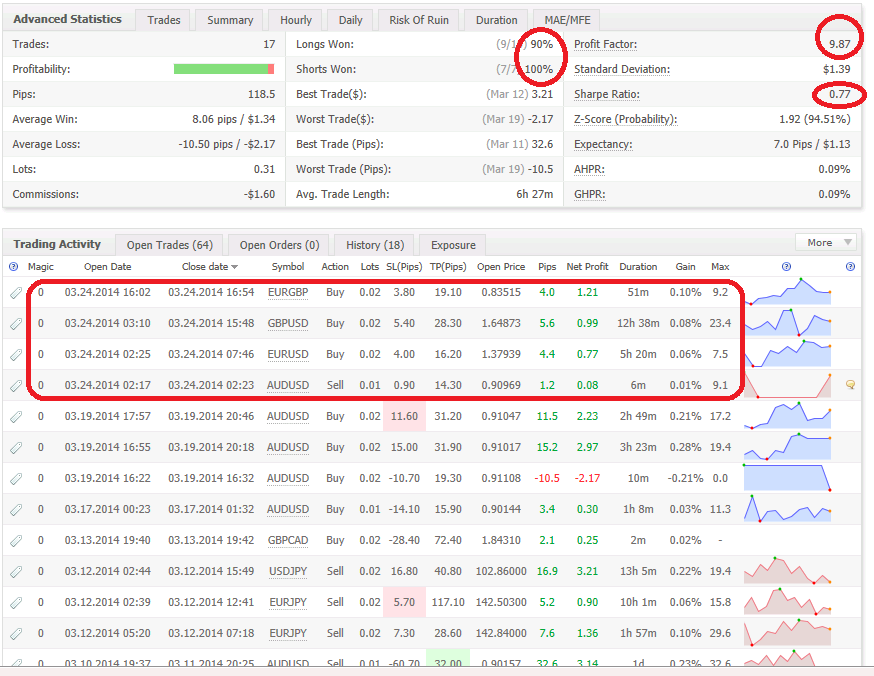 Tengo una cuenta con mi EA en 4 pares http://www.myfxbook.com/members/LuisGarcia/my-ea/840939 y tengo otra cuenta de momento privada, pues no tengo nada interesante que mostrar (solo que la quebre una vez, y ahora gano solo 9 dolares en lo que va del mes) donde le meto de todo: mis EAs (aun en pruebas forward real), señales (pesimos) pero estoy aprendiendo a escogerlos y configurar sus riesgos (aca pienso como inversionista no como trader) y también una que otra operación manual solo por el gusto de hacerlo. Aunque, debido a mi formacion y habilidades, me inclino por el trading automatico, hoy; analizando mis trades manuales me he dado con la sorpresa de unos resultados prometedores. Aclaro no hago trading manual sencillamente porque todo el tiempo estoy estudiando forex, implementando, probando, analizando, optimizando y testeando mis EAs, aparte del trabajo. Estos son mis trades manuales (excluyendo el oro que aun me es adverso) en esta cuenta real que despues de haberla quebrado en el pasado, este mes de marzo 2014 la retome para pruebas y ya con mayor conocimiento de mis errores pasado, solo tiene lo que va del mes, se que son pocos trades pero es lo que tengo, no les pormeto mostrar mi evolución manual pues en las próximas semanas no me dedicare al trading manual sino esporádicamente y solo por "amor al arte" : Trades: 13 Longs Won: (6/7) 85% Profit Factor: 8.47 Profitability: Shorts Won: (6/6) 100% Standard Deviation: $1.56 Pips: 103.3 Best Trade($): (Mar 12) 3.21 Sharpe Ratio: 0.75 Average Win: 9.48 pips / $1.53 Worst Trade($): (Mar 19) -2.17 Z-Score (Probability): 1.81 (92.97%) Average Loss:-10.50 pips / -$2.17 Best Trade (Pips): (Mar 11) 32.6 Expectancy: 7.9 Pips / $1.25 Lots: 0.24 Worst Trade (Pips): (Mar 19) -10.5 AHPR: 0.10% Commissions:-$1.21 Avg. Trade Length: 6h 59m GHPR: 0.10% Y esto es sencillamente scalping manual, el año pasado mi trading manual tuvo 5% de ganancia, y creo que siempre fui rentable con scalping manual, solo que se necesita conocerse a uno mismo para poder ver los limites que cada uno tiene. No me dedicare a desarrollar este tipo de trading hasta mas adelante pero ya ven no es tan malo como lo pintan algunos, es solo que cada uno escoge lo que mejor le va. Tampoco es mi interés - aun - ganar con este tipo de trading ya que tengo mi propio plan de acción en forex. Yo simplemente no les puedo explicar como hago para meter una operación manual, pues no uso indicadores solo miro la grafica y zass veo hacia donde colocar la orden, voy por pocos pips, siempre con SL como pueden ver en la imagen, eso si una vez metida la operación no le quito la vista (por eso no pueden ser, ahí esta lo estresante e inhumano y por lo tanto no va con mi personalidad meter operaciones que puedan durar mas tiempo. saludos PD: lamentable lo de pepote y oleo. Supongo regresaran pronto.