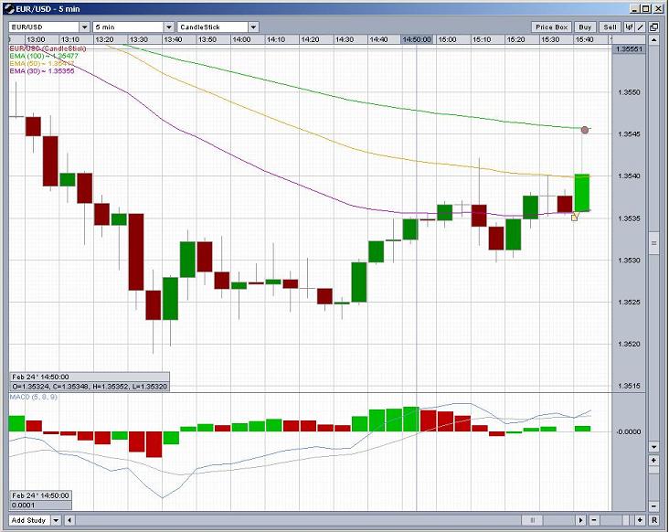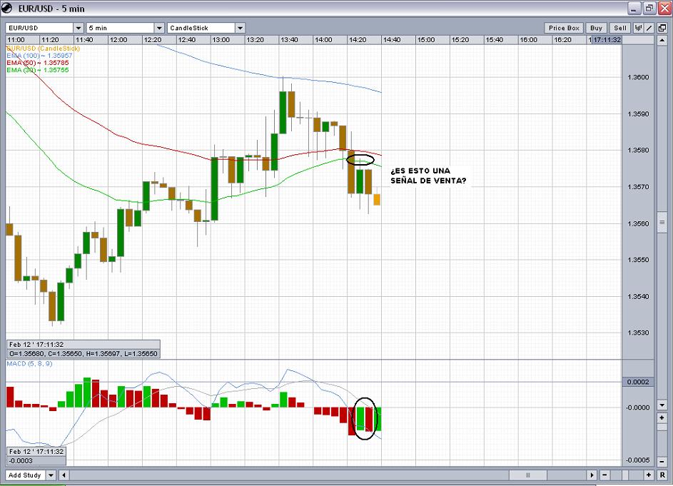 ). Luego de los fundamentales de las 13:30 GMT el precio se fue para arriba alcanzando la EMA(100), lo que deja invalidada cualquier señal de venta por el momento. Luego el precio baja y rompe la Z30-50, hace un pullback y da una "aparente" señal de venta...